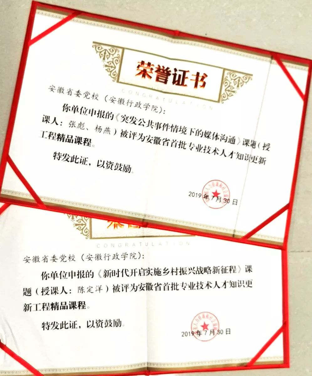 日前,安徽省人力资源和社会保障厅公布了2018年度首批“专业技术人才知识更新工程精品课程”,省委党校(安徽行政学院)副校(院)长袁维海讲授的《贯彻新发展理念、实现高质量发展》,决策咨询部主任张彪和工商管理教研部副教授杨燕讲授的《突发公共事件情境下的媒体沟通》,工商管理教研部教授陈定洋讲授的《新时代开启实施乡村振兴战略新征程》,决策咨询部教授倪良新参与讲授的《让绩效考核利器驱动业绩增长》等4门课程成功入选。
