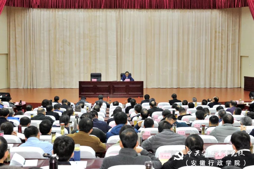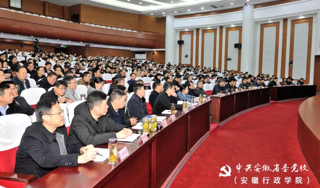 教育长胡忠明主持报告会。省委党校(安徽行政学院)秋季学期主体班学员,校(院)中心组成员、副教育长、各处室和直属单位主要负责人等约420人聆听了报告会。