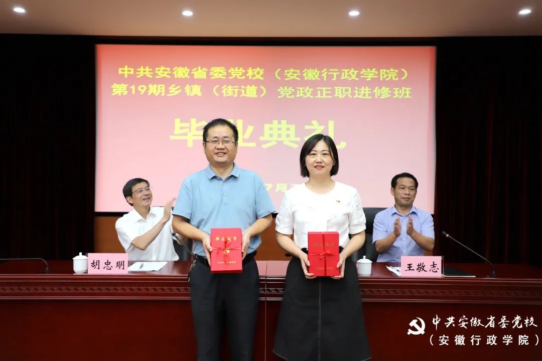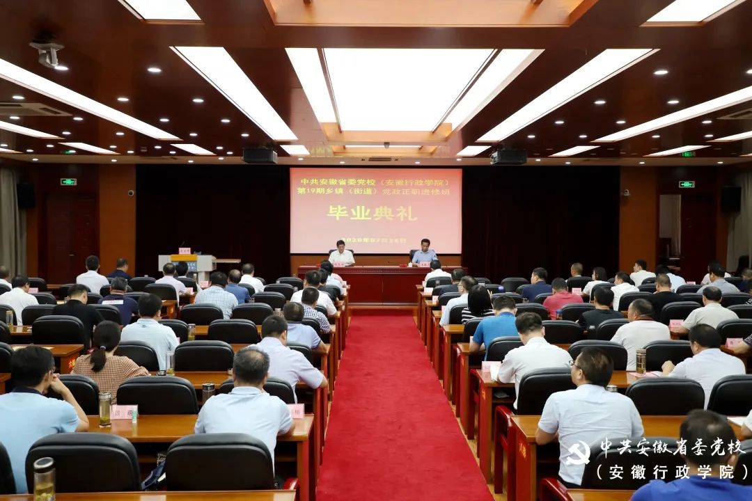 7月28日下午,省委党校(安徽行政学院)第19期乡镇(街道)党政正职进修班毕业典礼在中校区举行。副校(院)长胡忠明出席并讲话,副教育长王敬志主持,进修班全体学员以及有关处室负责人参加毕业典礼。